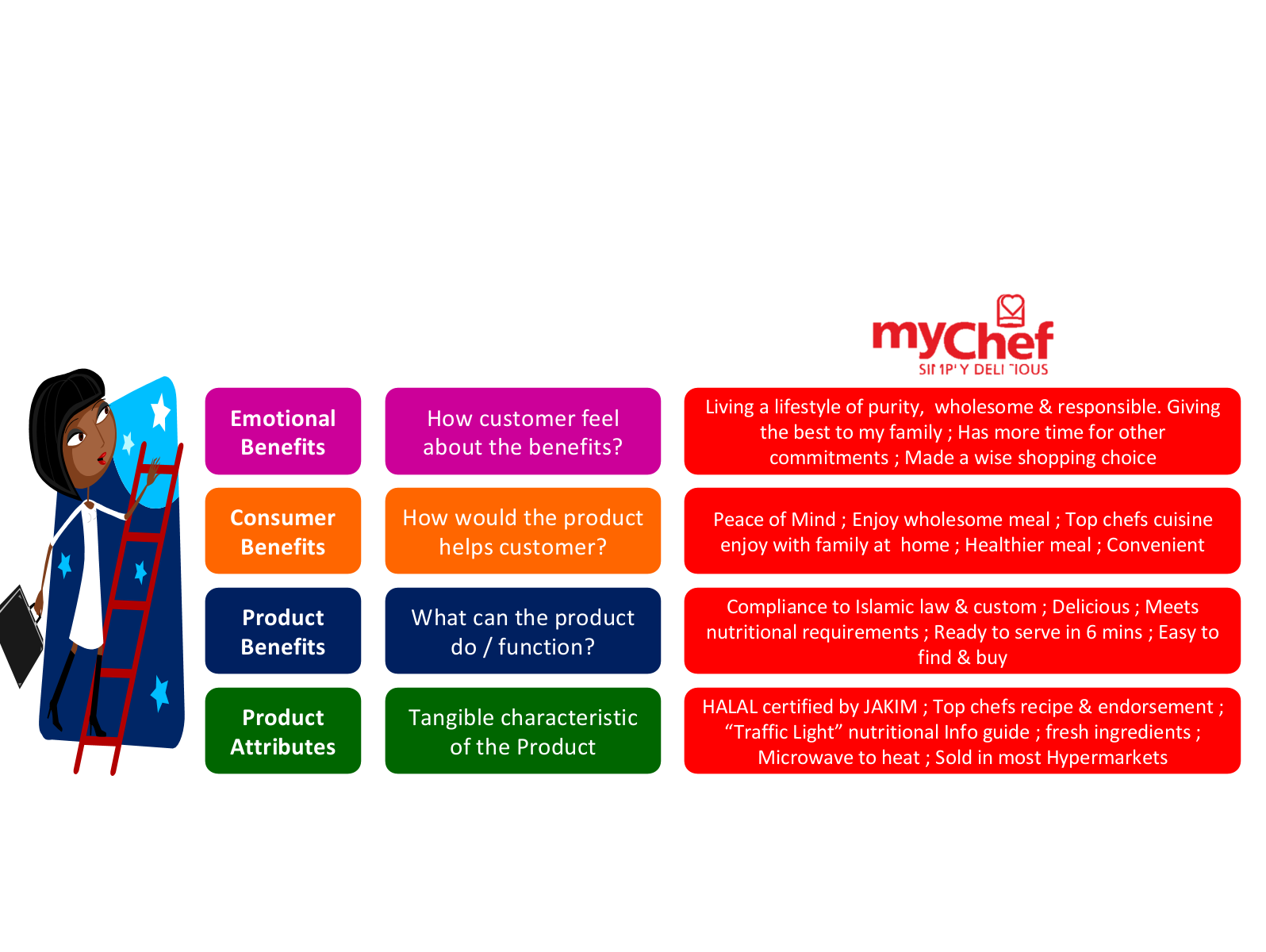 Exporter is encouraged to adopt the Benefit Laddering concept to fulfil the functional and emotional buying behaviour of consumer which directly affects consumer buying decision. We use one of the newly launched brand “MyChef – Ready To Serve Meal” Halal Product to illustrate the model.